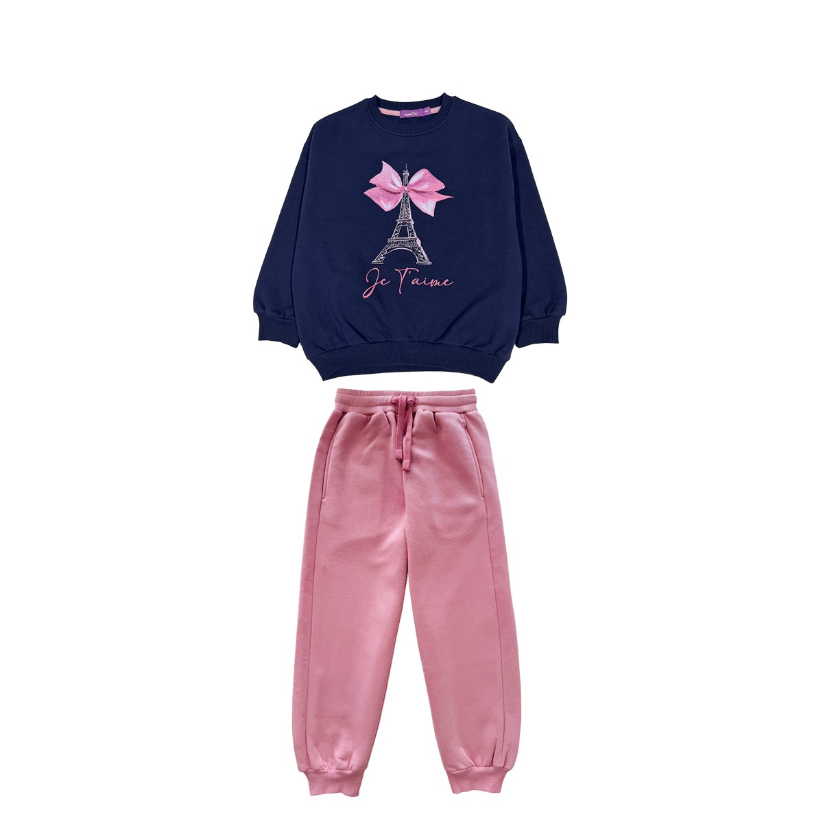 Ensemble sweatshirt col rond en molleton gratté marine + pantalon baggy joggers en molleton gratté rose avec ceinture élastiquée et cordon d'ajustement